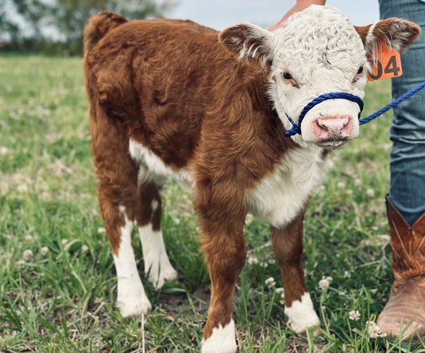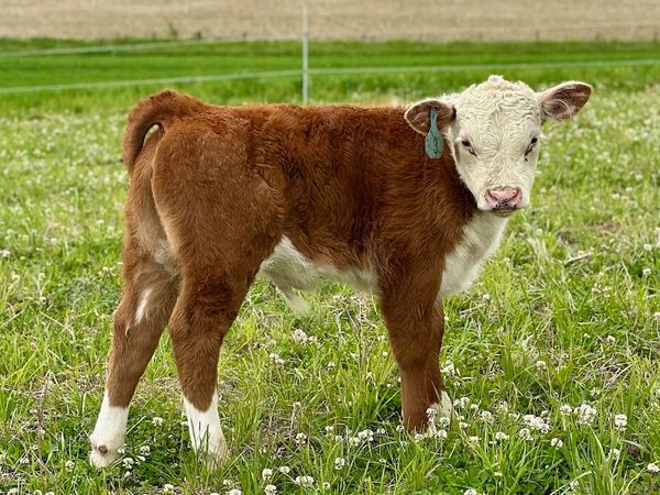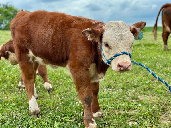 (AVAILABLE) Meet our heifer calf named "Marigold". Her DOB is April 13th 2025. She has been introduced to a halter and is registered and DNA'd. Marigold is Dehorned. She is weaned and ready for her new home. $1800
